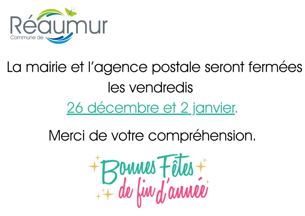 La mairie et l'agence postale seront fermées les vendredis 26 décembre et 2 janvier.
