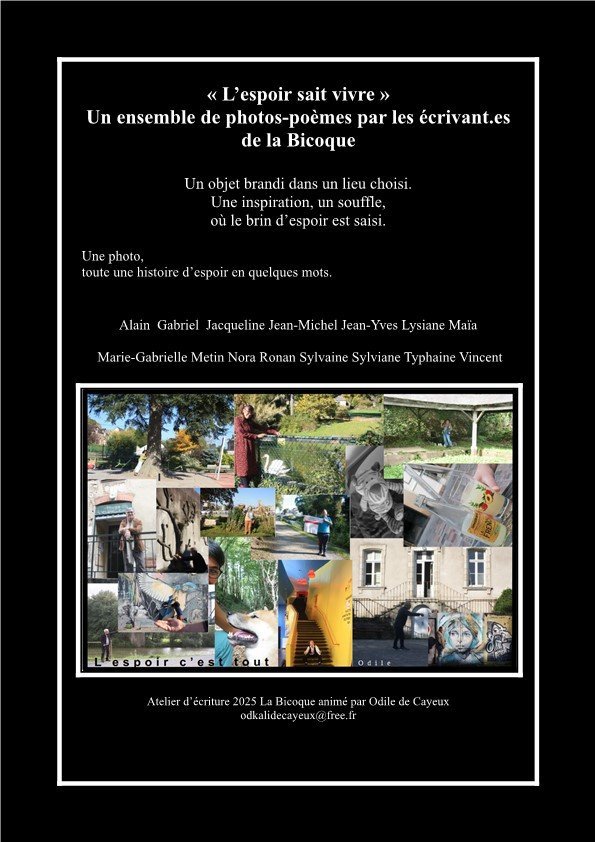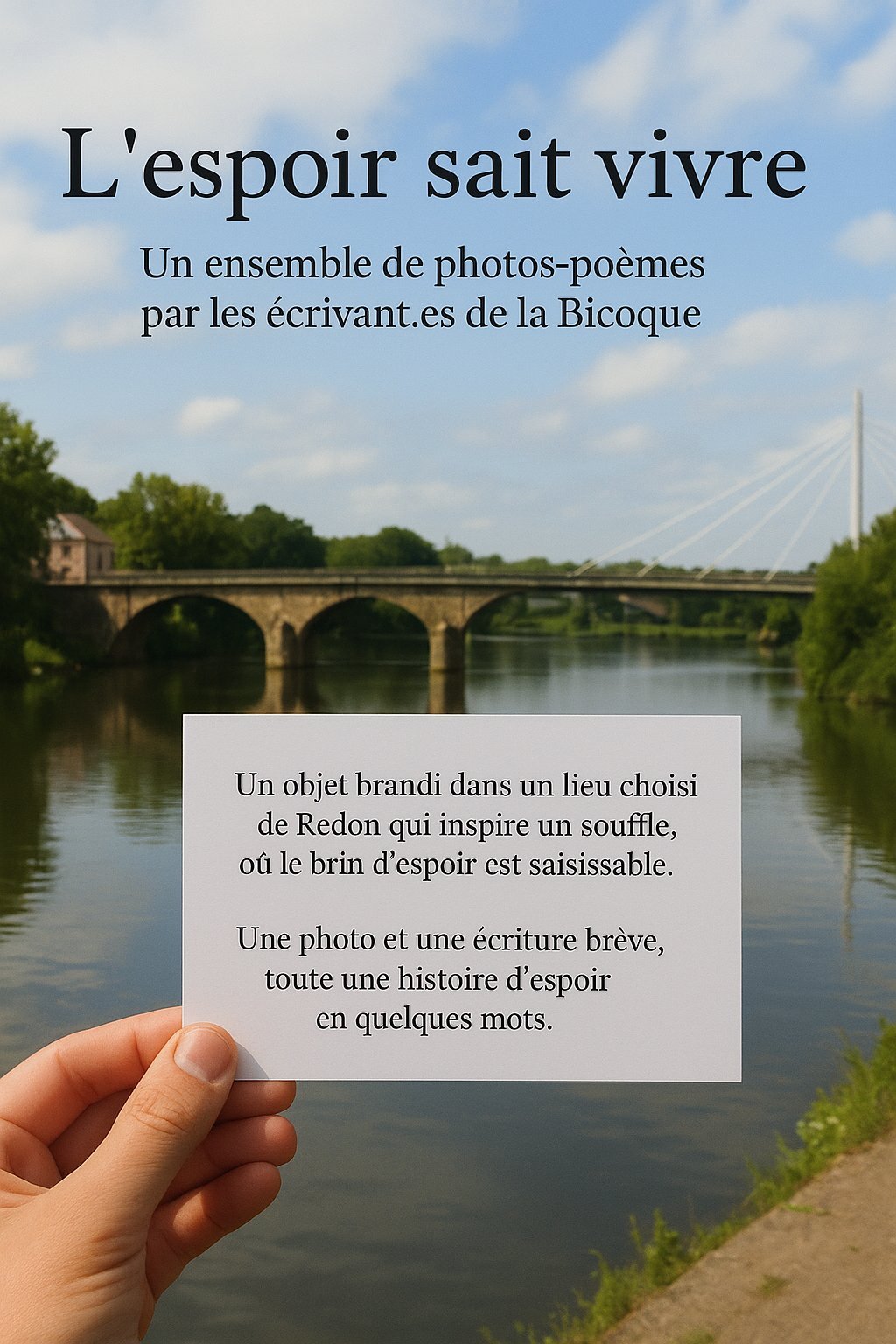 Un ensemble de photos-poèmes par les écrivant.es de la Bicoque. Un objet brandi dans un lieu choisi de Redon qui inspire un souffle, où le brin d’espoir est saisissable. Une photo et une écriture brève, toute une histoire d’espoir en quelques mots.