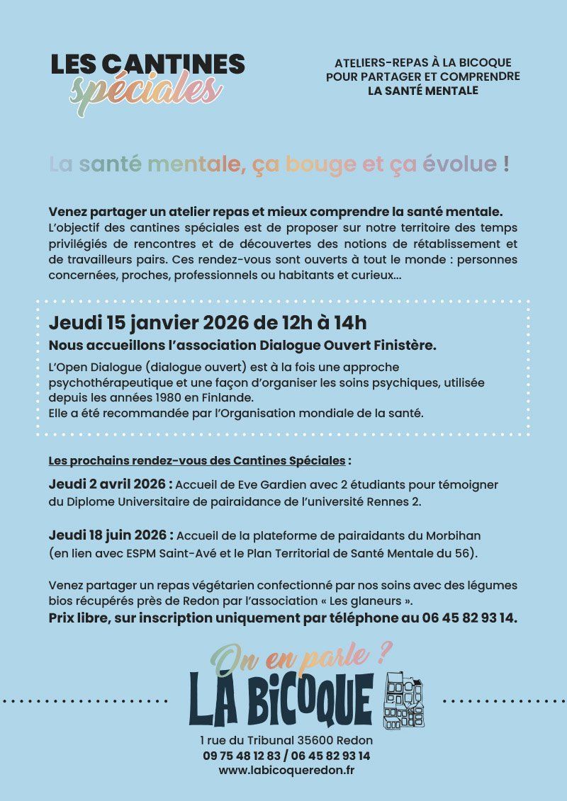 La santé mentale concerne tout le monde ! Elle bouge et évolue. Venez partager un atelier repas et mieux comprendre la santé mentale. Cette semaine, nous découvrirons L'Open dialogue (Dialogue ouvert). C’est à la fois une approche psychothérapeutique et une façon d'organiser les soins psychiques, utilisée depuis les années 1980 en Finlande. Elle a été recommandée par l’Organisation mondiale de la santé