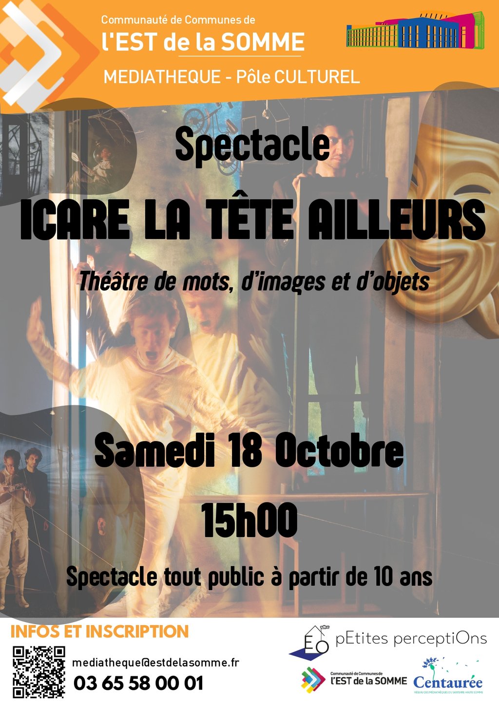 - Sam. 18 oct. – 15h : Icare la tête ailleurs – Théâtre de mots, d’images et d’objets (tout public dès 10 ans).
