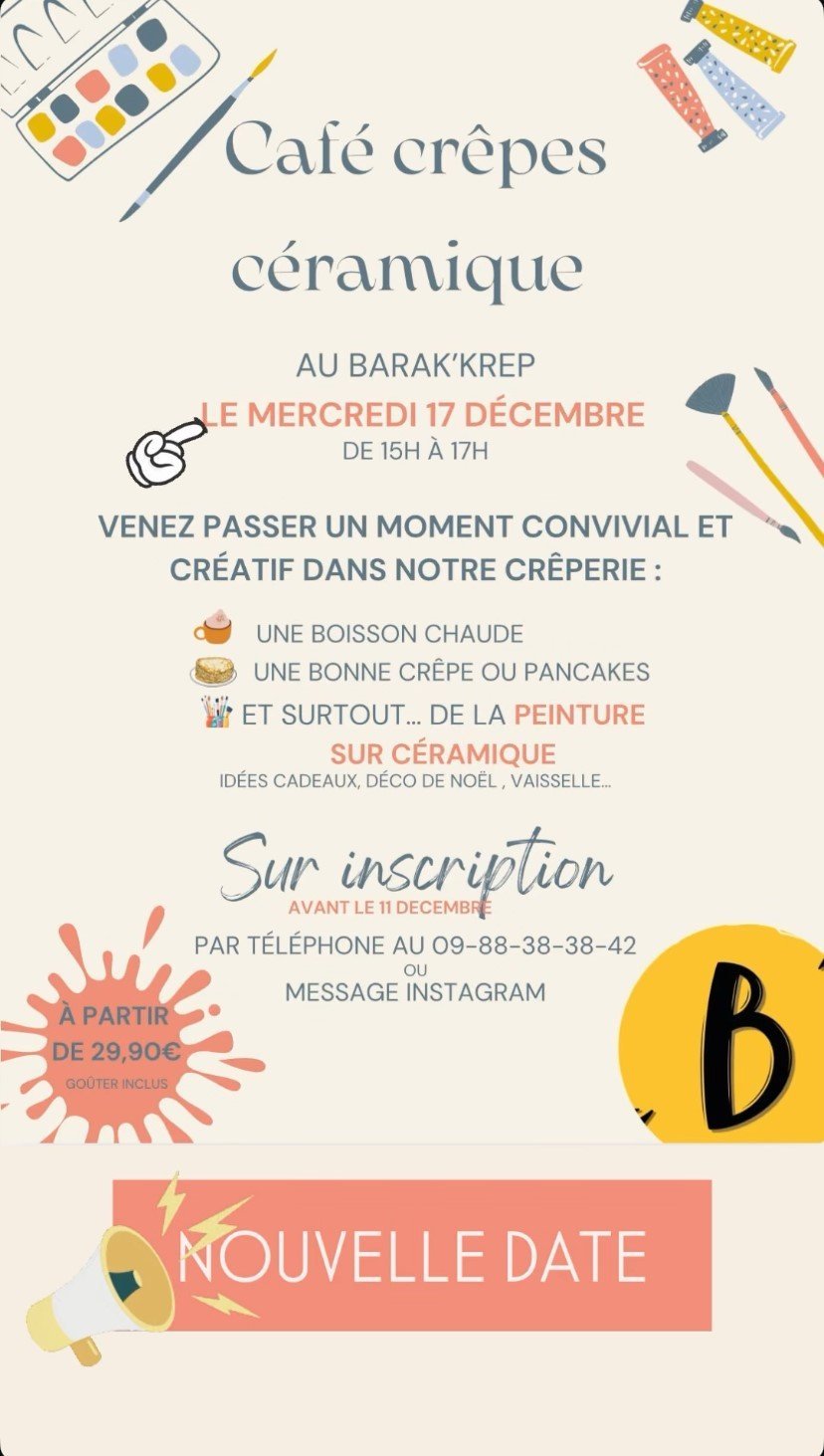 Au programme : décoration, partage, convivialité et détente tout en dégustant une bonne crêpe accompagnée de sa boisson chaude. Plusieurs objet seront disponibles.