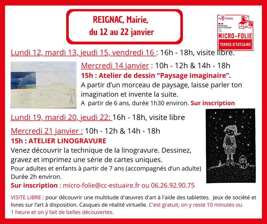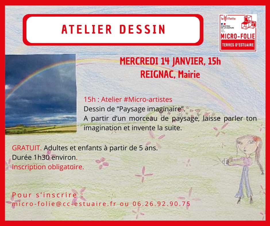 Mercredi 14 janvier : 15h : Atelier de dessin "Paysage imaginaire". À partir d'un morceau de paysage, laisse parler ton imagination et invente la suite. À partir de 5 ans, durée 1h30 environ. GRATUIT. Sur inscription : micro-folie@cc-estuaire.fr ou 06.26.92.90.75