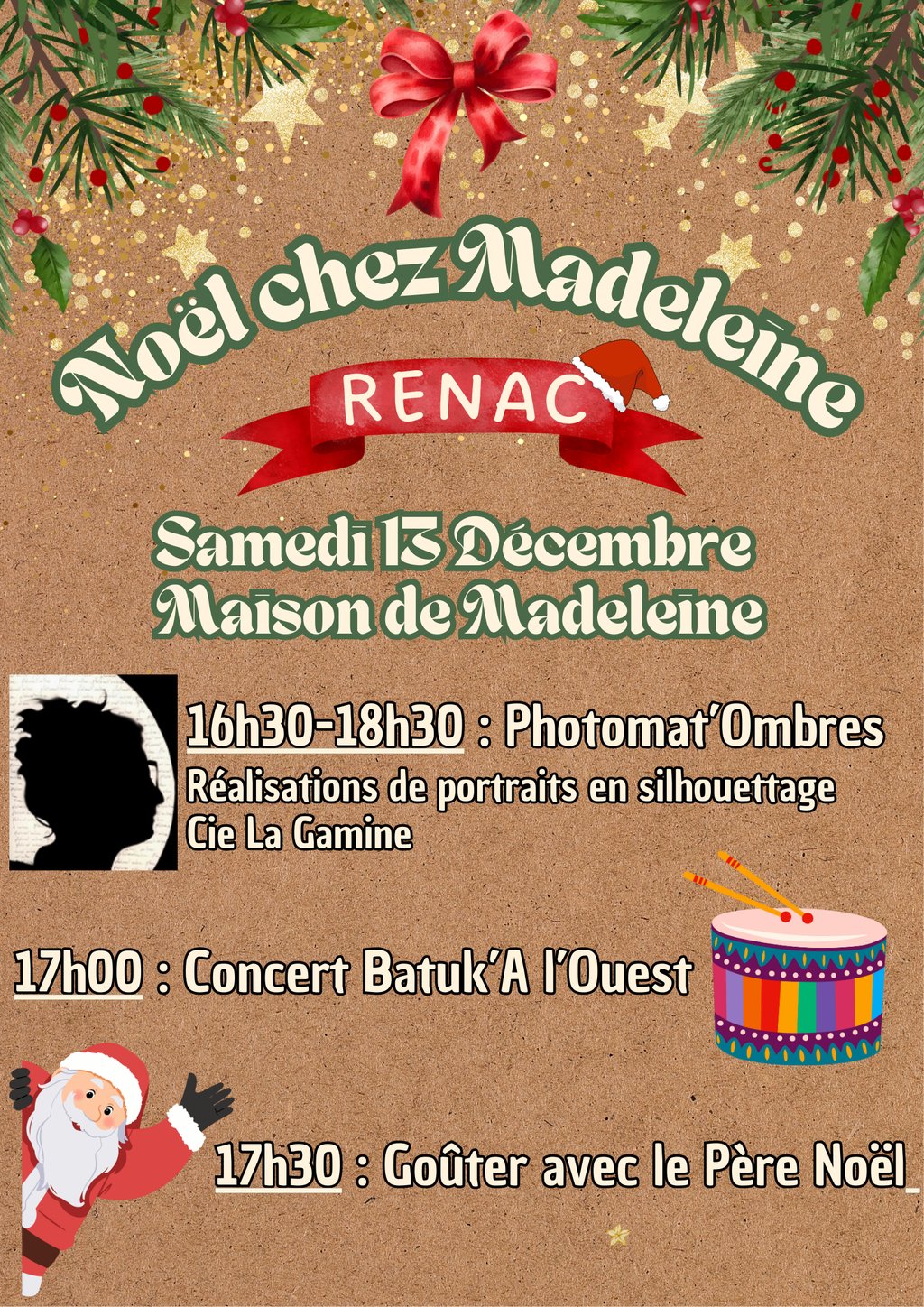 Le Père Noël vous donne rendez-vous à la Maison de Madeleine le 13 décembre, la compagnie La Gamine et Batuk'A l'Ouest seront aussi présents.