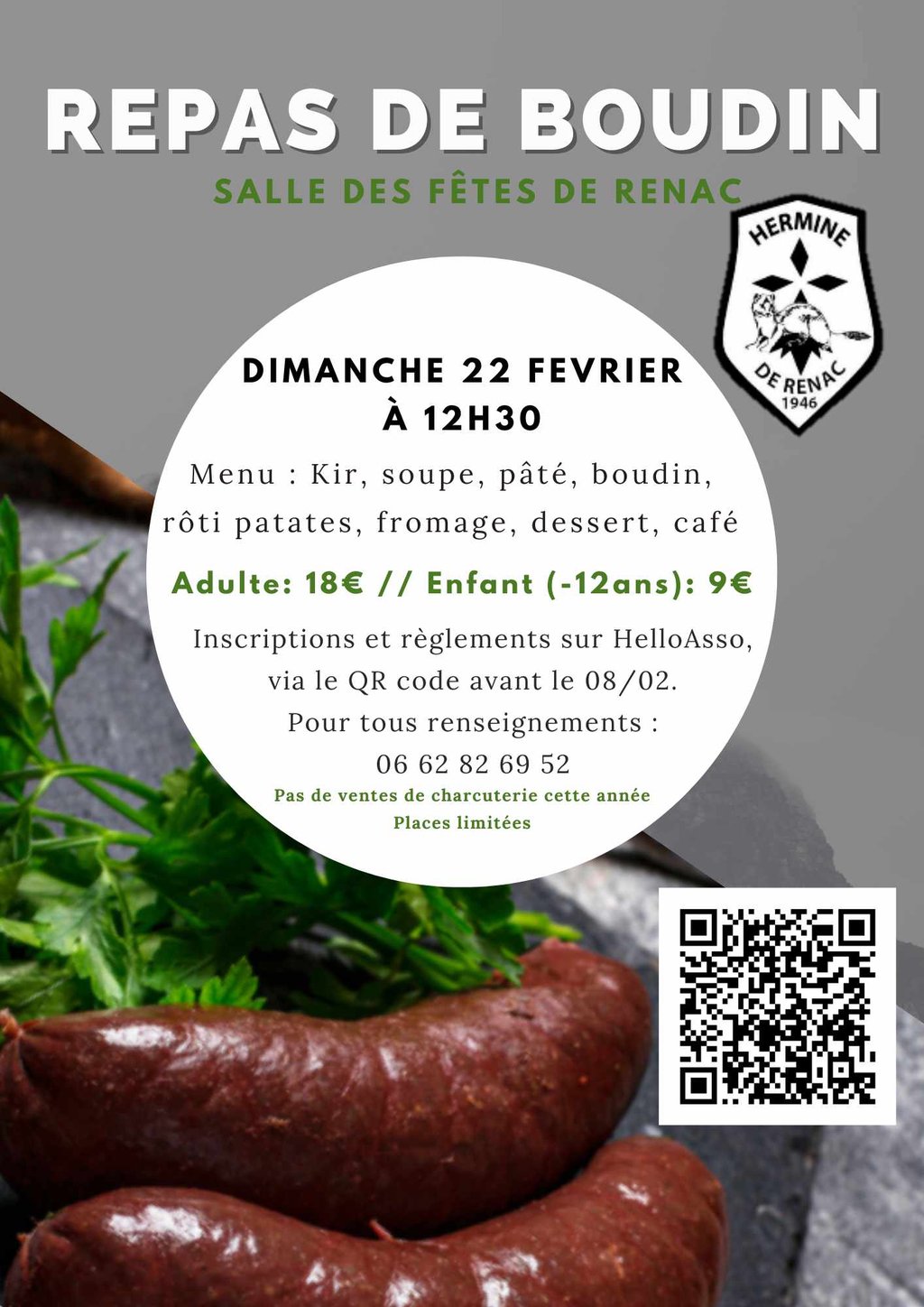 Le traditionnel Repas de Boudin de l'Hermine aura lieu cette année le Dimanche 22 Février à 12h30 à Salle des Fêtes de Renac.
