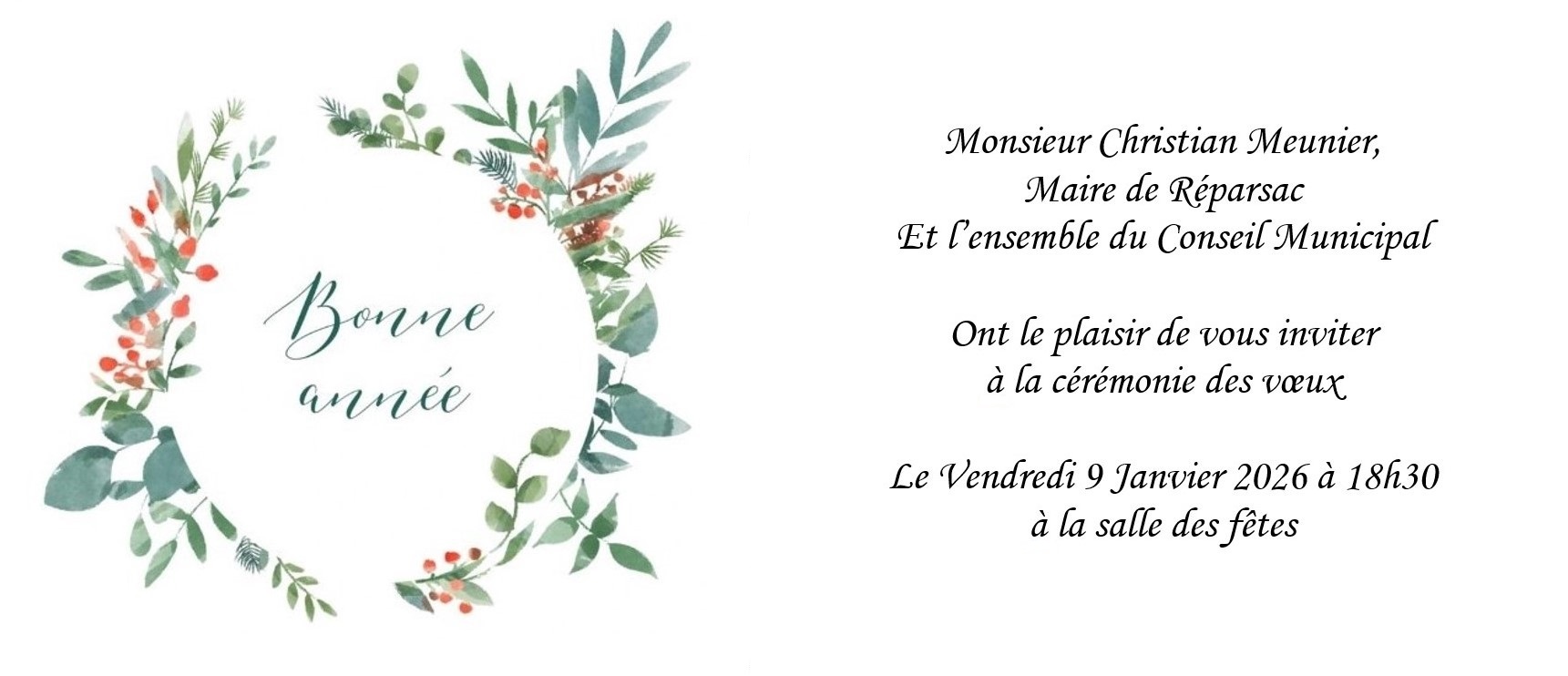 Vous êtes cordialement invités à la cérémonie des vœux du Maire le vendredi 9 janvier à 18h30 à la salle des fêtes.