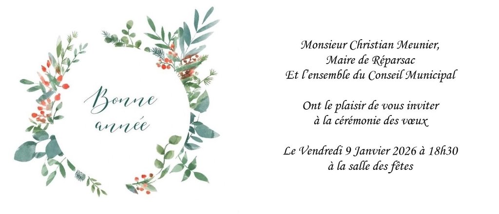 Chers habitants de la commune, l'ensemble du conseil municipal, les agents communaux de Réparsac vous souhaitent leurs meilleurs vœux pour cette nouvelle année.