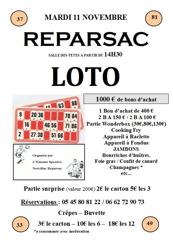 Le mardi 11 novembre LOTO annuel du club de football de l'Entente Sportive Nercillac Réparsac