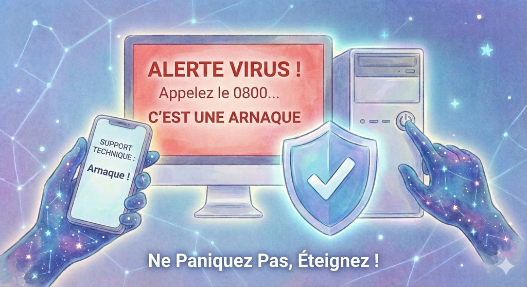 👉 Le conseil gratuit : Si ça vous arrive, ne paniquez pas. Ne cliquez sur rien. Éteignez votre ordinateur "à la sauvage" (en restant appuyé sur le bouton d'alimentation) et rallumez-le. L'alerte aura souvent disparu.