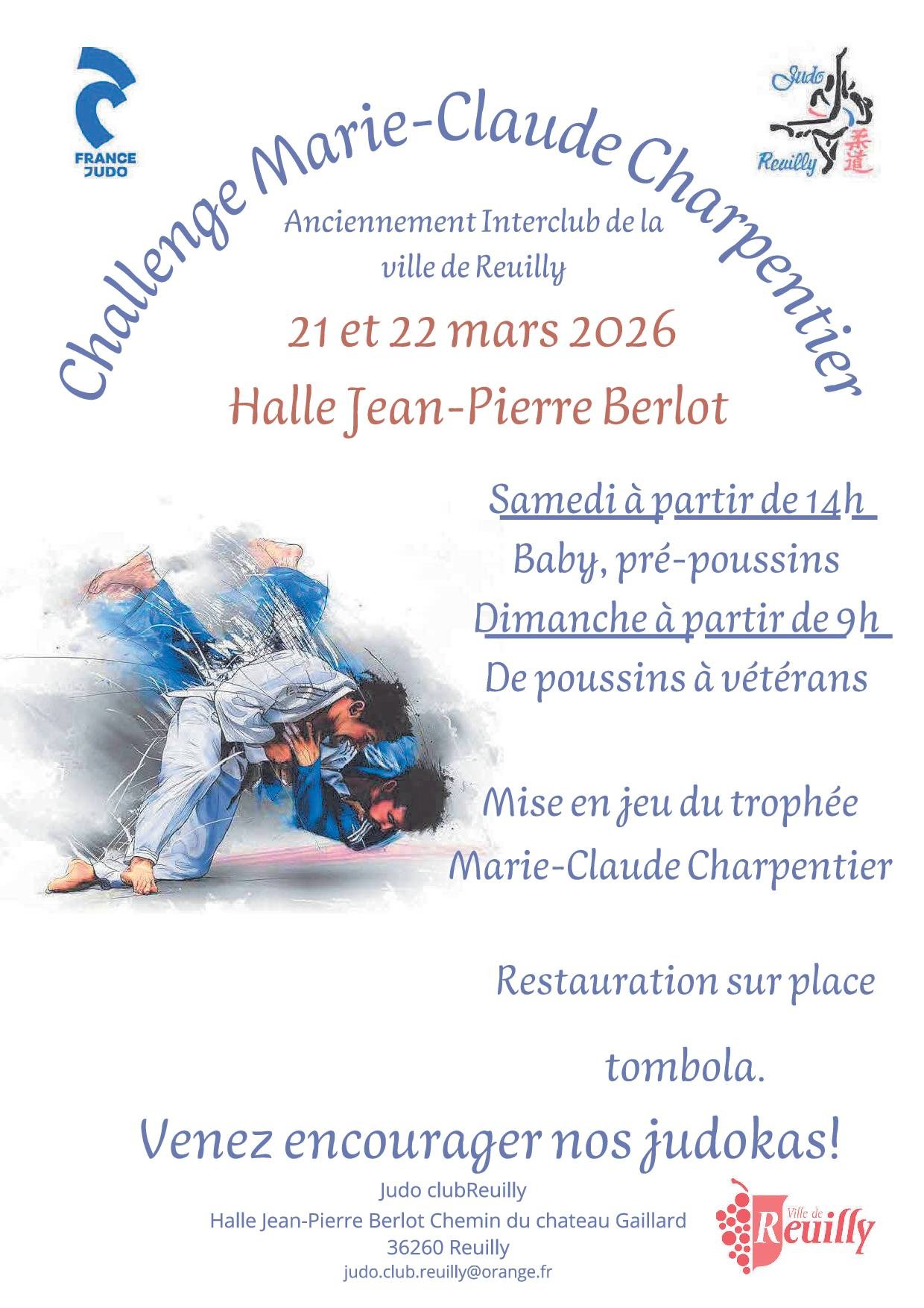 Le Judo Club Reuillois organise la troisième édition du Challenge Marie-Claude CHARPENTIER les samedi 21 et dimanche 22 mars 2026. Plus de 250 combattants sont attendus sur cette manifestation !