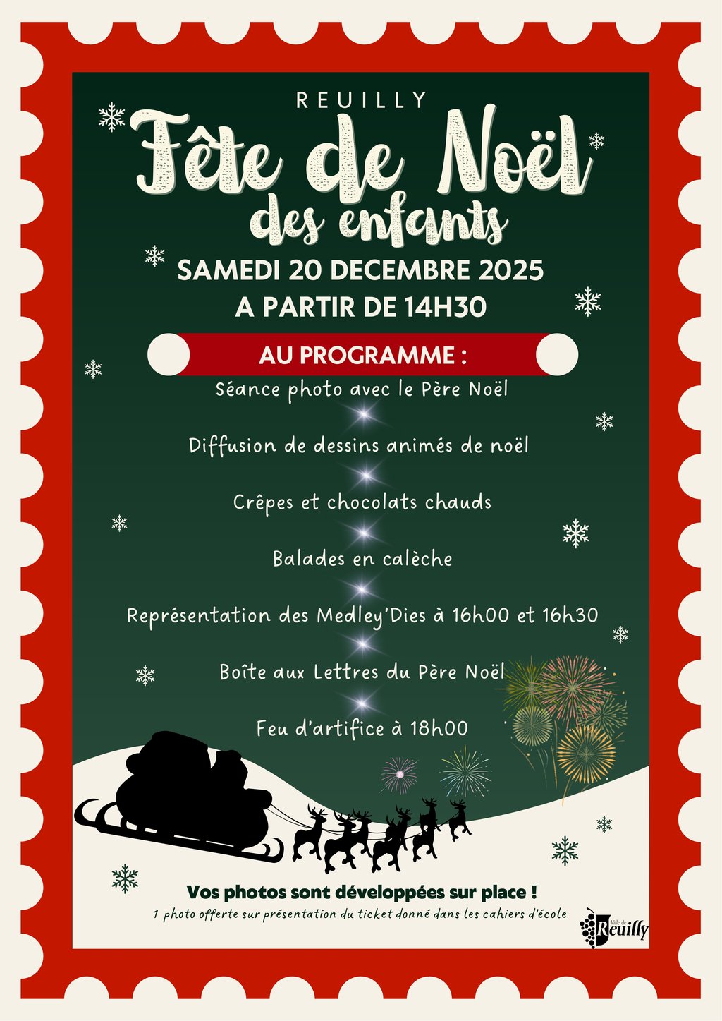 🎈 Une après-midi féerique les attend avec une rencontre privilégiée et une séance photo inoubliable avec le Père Noël (vos photos seront développées sur place, et une vous sera offerte sur présentation du ticket de l'école 📸), des dessins animés de Noël pour rêver, des balades enchantées en calèche 🐴, et de délicieuses crêpes accompagnées de chocolats chauds ☕. Ne manquez pas les Medley’Dies à 16h00 et 16h30, et n'oubliez pas de déposer votre précieux courrier dans la boîte aux lettres du Père Noël ! ✉️