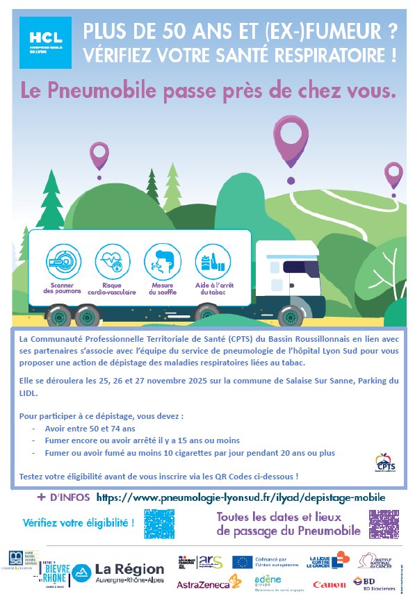 La Communauté Professionnelle Territoriale de Santé (CPTS) du Bassin Roussillonnais, en lien avec ses partenaires, s’associe avec l’équipe du service de pneumologie de l’hôpital Lyon Sud pour proposer une action de dépistage des maladies respiratoires liées au tabac pour les personnes âgées de 50 à 74 ans.