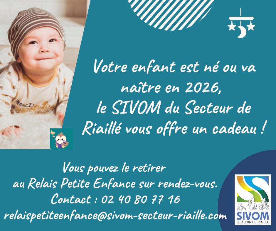 Votre famille s'agrandit cette année ? Le SIVOM du Secteur de Riaillé a le plaisir d'offrir un cadeau de bienvenue à tous les nouveaux- nés des communes de Joué sur Erdre, Pannecé, Riaillé, Teillé et Trans sur Erdre !