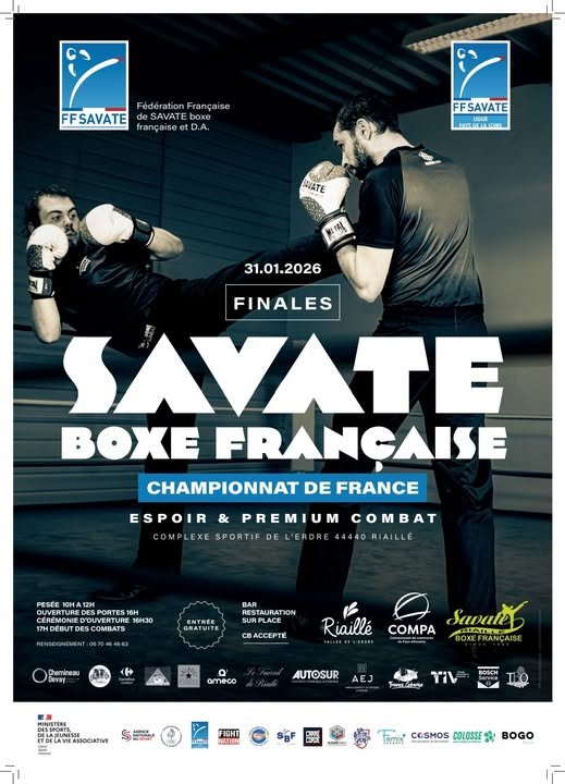 Préparez-vous ! Le samedi 31 janvier 2026, le complexe sportif de Riaillé vibrera au rythme des coups et des combats ! Après près de 10 ans d'attente, votre club local de Savate Boxe Française est fier d'organiser les finales tant attendues du Championnat de France Espoir et Premium en combat.