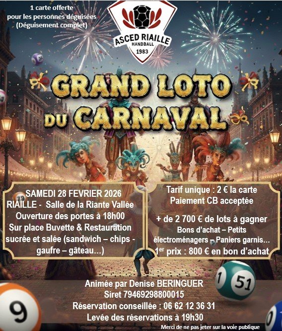 L'ASCED Riaillé Handball vous convie à son grand loto du carnaval animé par Denise BERINGUER (06 62 12 36 31) le samedi 28 février 2026 à la salle de la Riante Vallée.