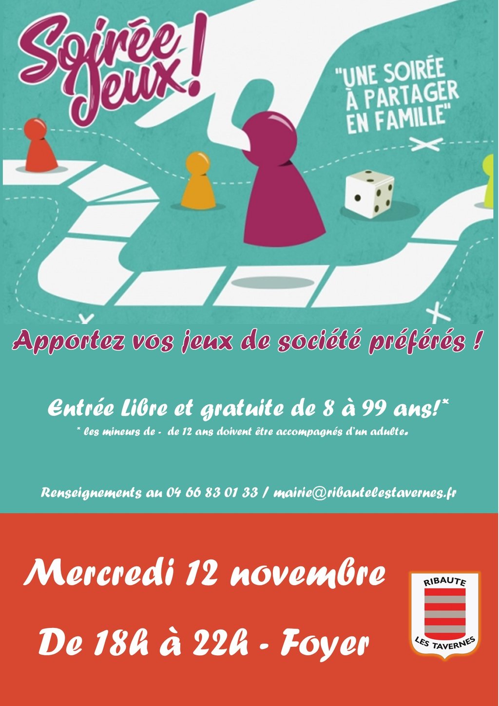 La Municipalité organise une soirée jeux de société le mercredi 12 novembre prochain. Nous vous donnons rendez-vous à partir de 18h au foyer (130 rue du 8 mai 1945). L'entrée est libre et ouverte aux personnes de huit ans et plus. Les mineurs de moins de 12 ans devront être accompagnés par un adulte.