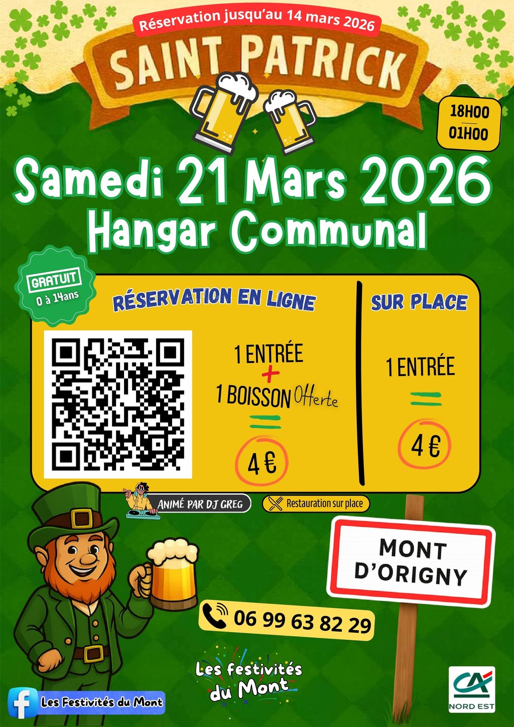 Préparez-vous pour une soirée festive et pleine de bonne humeur ! Le Hangar Communal (Espace PAUL LECAS) se pare de vert pour célébrer la Saint-Patrick comme il se doit.