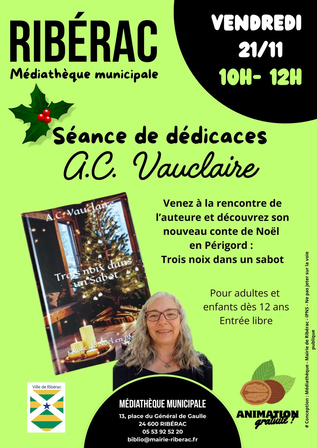 Venez à la rencontre de l'auteure et découvrez son nouveau conte de Noël en Périgord : Troix noix dans un sabot