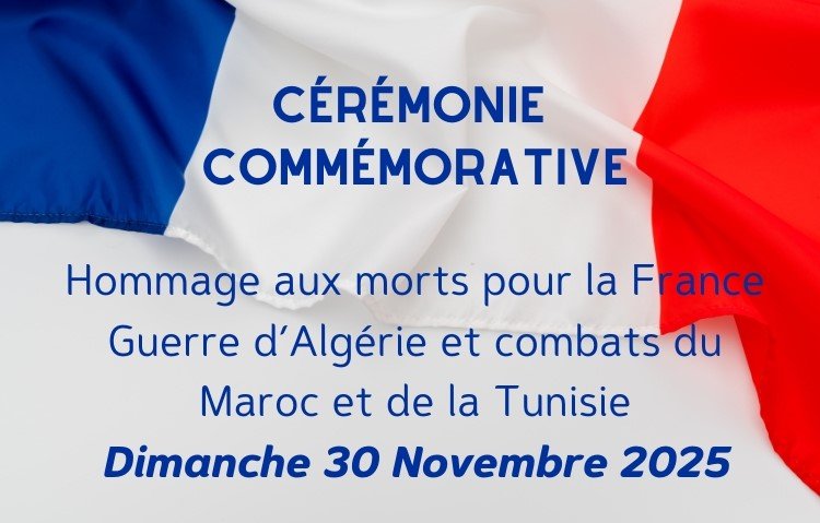Dimanche 30 Novembre 2025 aura lieu la cérémonie commémorative d'hommage à tous les morts pour la France pendant la guerre d'Algérie et les combats du Maroc et de la Tunisie.