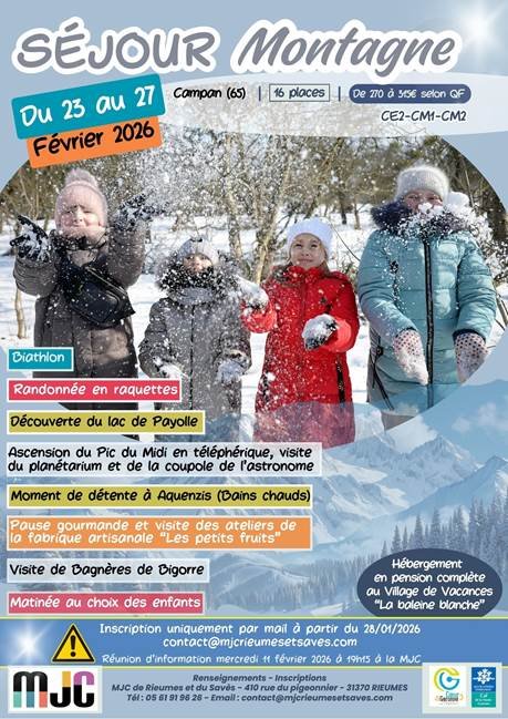 La Mjc de Rieumes propose pour les vacances de février un Séjour Montagne pour les enfants (CE2-CM1-CM2) à Campan (65) du 23 au 27 février 2026.