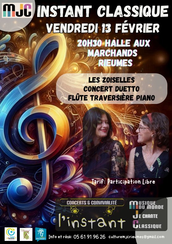 Vendredi 13 février, la MJC de Rieumes et du Savès vous propose un concert de musique classique avec le duetto "Les Zoiselles" : flûte traversière et piano.