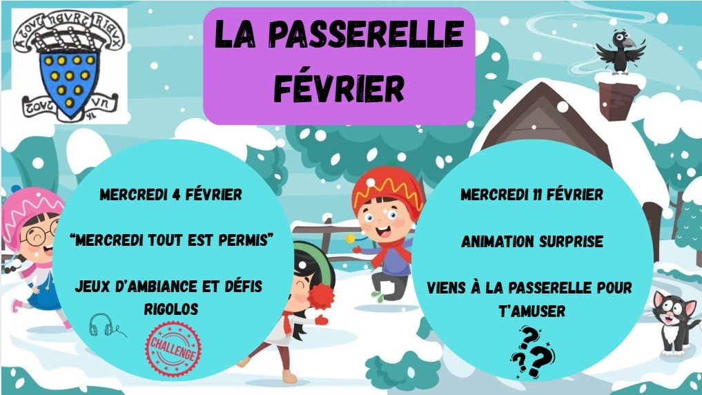 Pour rappel, pas de passerelle mercredi 18 et mercredi 25, mais pas de panique, nous aurons à la place l'ouverture de l'Espace Jeunes (10/17 ans) du lundi 16 au vendredi 27 février (fermé samedi et dimanche),
