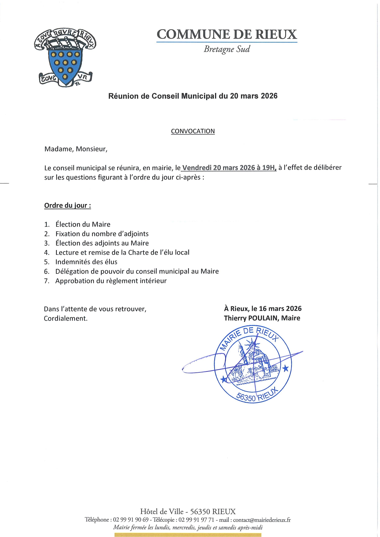 Le conseil municipal se réunira, en mairie, le Vendredi 20 mars 2026 à 19H, à l’effet de délibérer sur les questions figurant à l’ordre du jour ci-après :