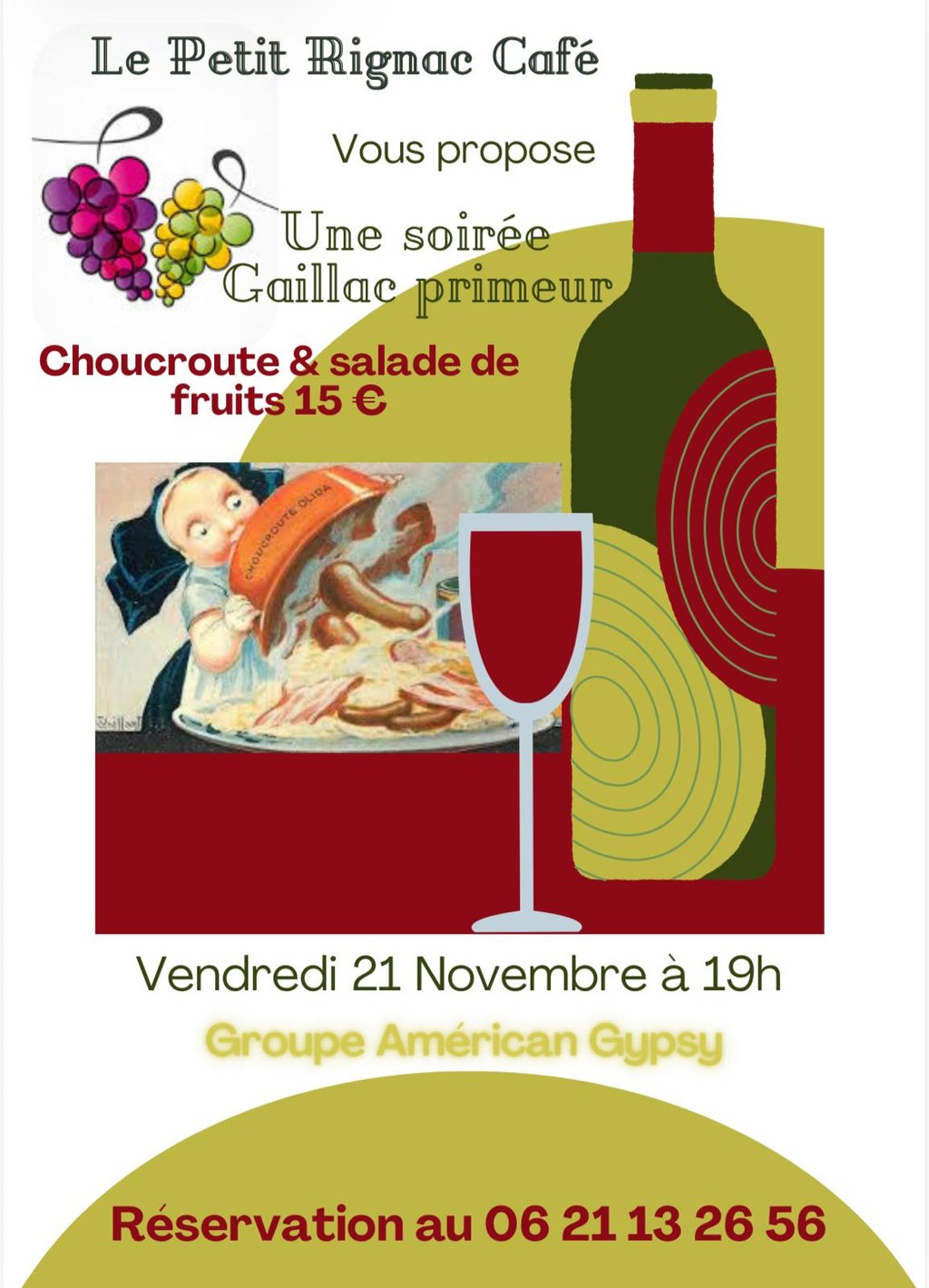 Le Petit Rignac vous propose le 21 novembre à 19h une soirée Gaillac Primeur avec une choucroute et une salade de Fruits à 15€ hors boissons