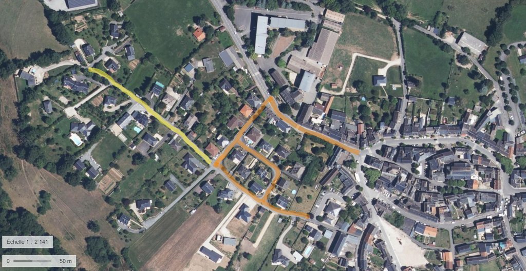 Ces opérations visent à réhabiliter les réseaux assainissement, éclairage public et télécom (en orange sur le plan) et à procéder à l’enfouissement des lignes de télécommunication et de l’éclairage public (en jaune sur le plan), afin d’améliorer la qualité du service tout en renforçant l’intégration paysagère.