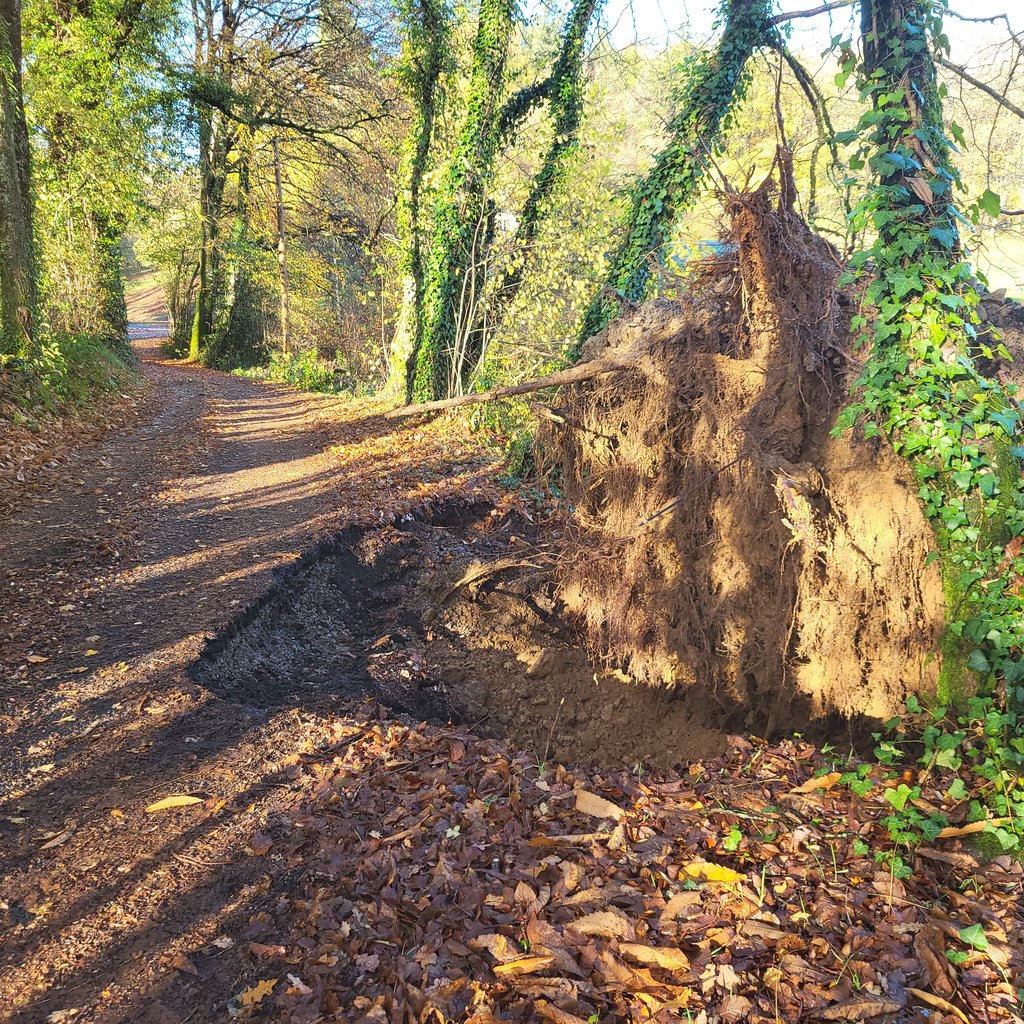 L'arbre déraciné par le vent a provoqué des dommages sur ce chemin (excavations et revêtement abîmé).