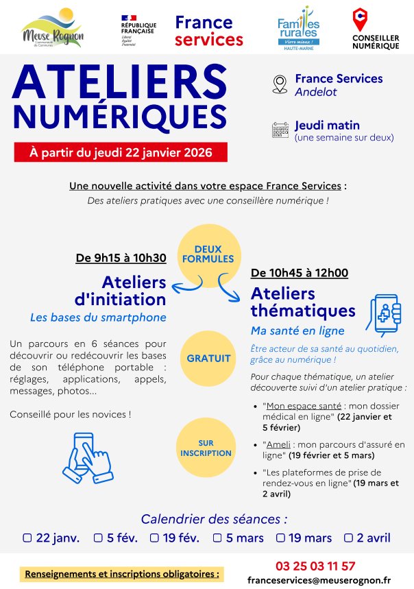 Une nouvelle session d'Ateliers Numériques commencera le jeudi 22 janvier 2026, 6 dates sont programmées tous les 15 jours au sein de France services à Andelot. (détail en pièce jointe)