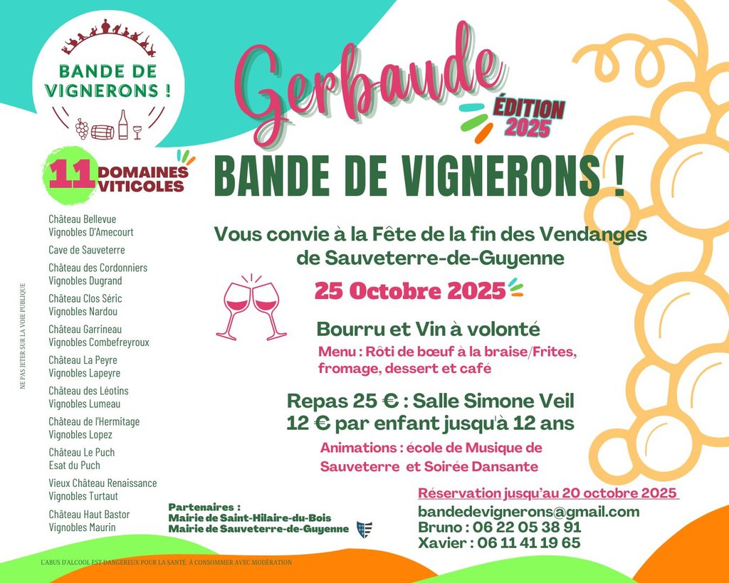 Après un été bien rempli, la Bande de Vignerons ! vous invite à célébrer la 3ᵉ édition de la Fête des Vendanges en salle communale Simone Veil, le samedi 25 octobre ! 🍇