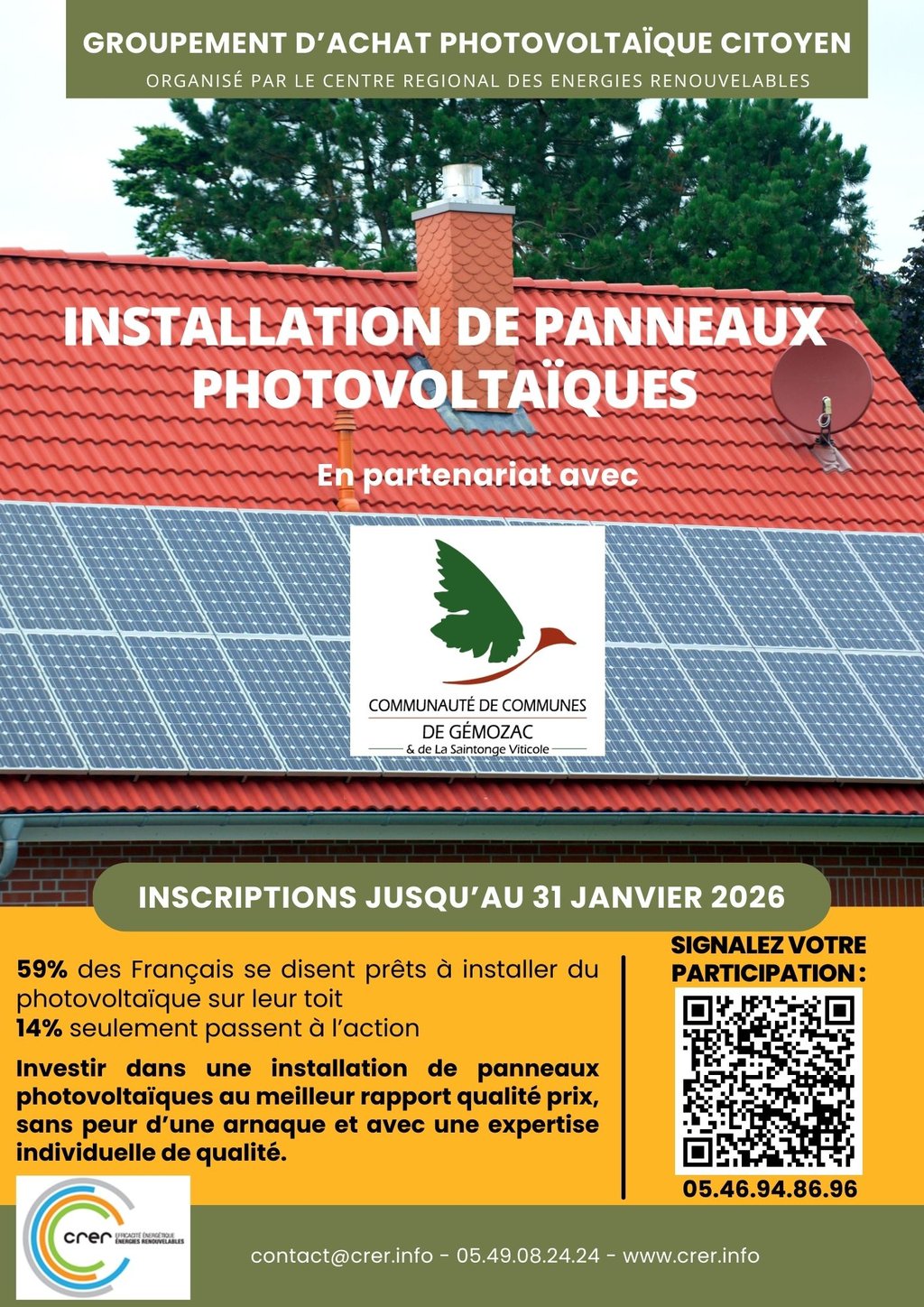 Le Centre Régional des Energies Renouvelables (CRER)* animateur de la plateforme FRANCE RENOV "Saintonge Habitat Energie" porte un groupement d’achat de panneaux photovoltaïques à destination des particuliers du territoire de la CDC de Gémozac.