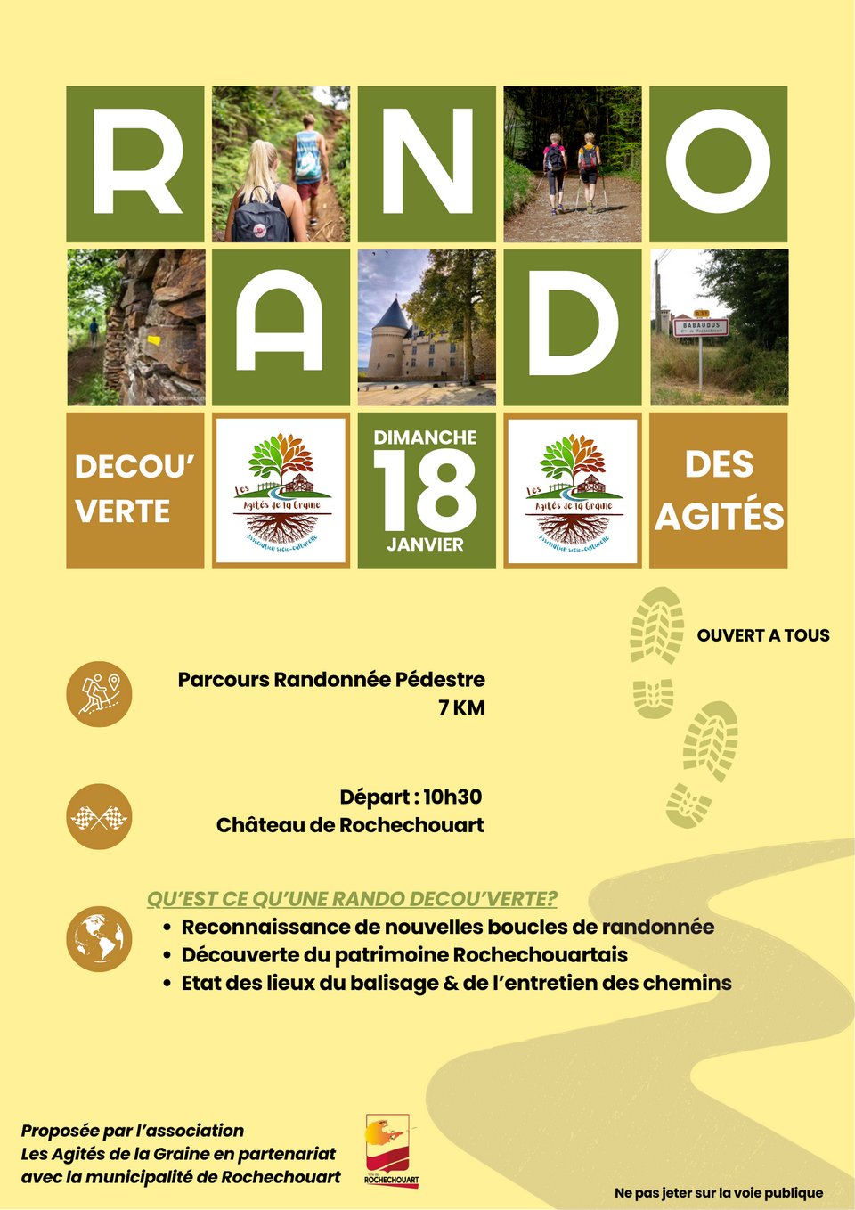 En collaboration avec la mairie, nous avons imaginé pouvoir proposer des chemins de randonnée entre 5 et 8 km (les balisages actuels étant plutôt entre 11 et 14) autour de la Ville de Rochechouart. Ces boucles "thématiques" devront permettre de mieux connaitre le patrimoine rochechouartais, notamment ses villages et sa campagne.