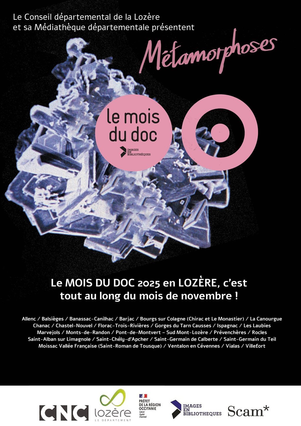 Mois du film documentaire, opération nationale est portée par la Médiathèque Départementale de Lozère. Cet évènement se déploie et s'enrichit année après année. Avec pour thématiqe nationale "Métamorphoses / Transformations".