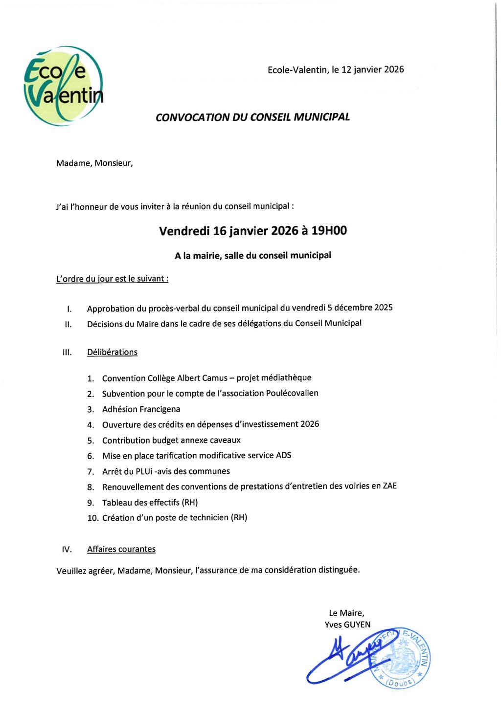 Conseil municipal vendredi 16 janvier 2026 à 19h00 en Mairie salle du Conseil municipal