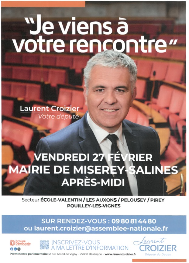 Monsieur Laurent Croizier, député de la 1ʳᵉ circonscription du Doubs, tiendra une permanence de proximité à la mairie de Miserey-Salines