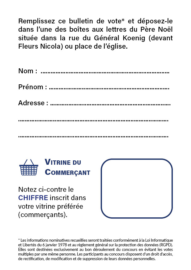 - soit en remplissant un bulletin de vote (disponible chez les commerçants participants et en mairie) et en le déposant dans une boîte aux lettres du Père Noël avant le 24 décembre.