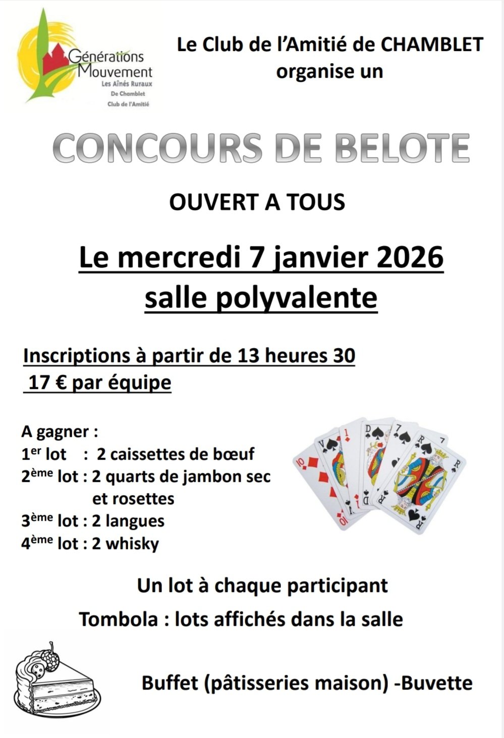 Le Club de l'Amitié vous donne rendez-vous mercredi 7 janvier à partir de 13h30 pour son concours de belote de début d'année.