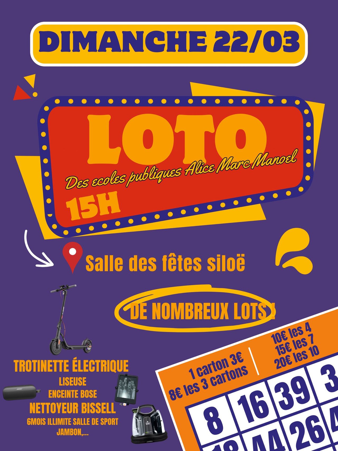 Nous vous donnons rendez-vous le dimanche 22 mars à 15h à la salle Siloë pour notre grand loto ! Venez passer un moment convivial en famille ou entre amis et tenter de repartir avec de nombreux lots.