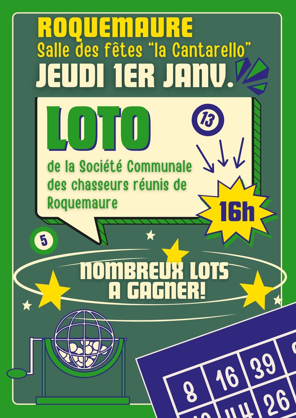 Rendez-vous jeudi 1er janvier Ă 16h Ă la salle des fĂȘtes La Cantarello pour le loto organisĂ© par la SociĂ©tĂ© Communale des Chasseurs RĂ©unis de Roquemaure !