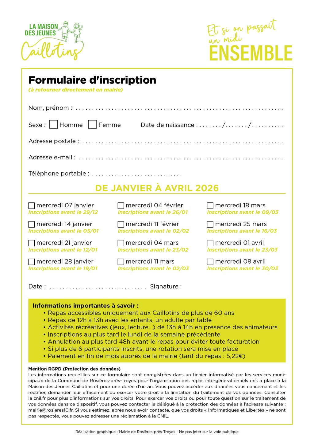 6 adultes (Caillotins de plus de 60 ans obligatoirement) maximum par repas (rotation possible si nombre important d'inscrits)