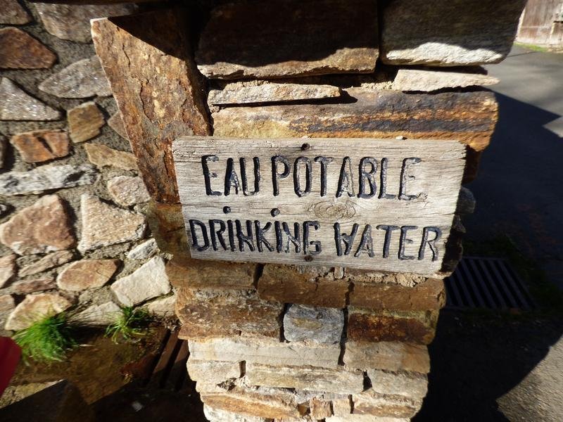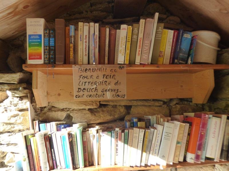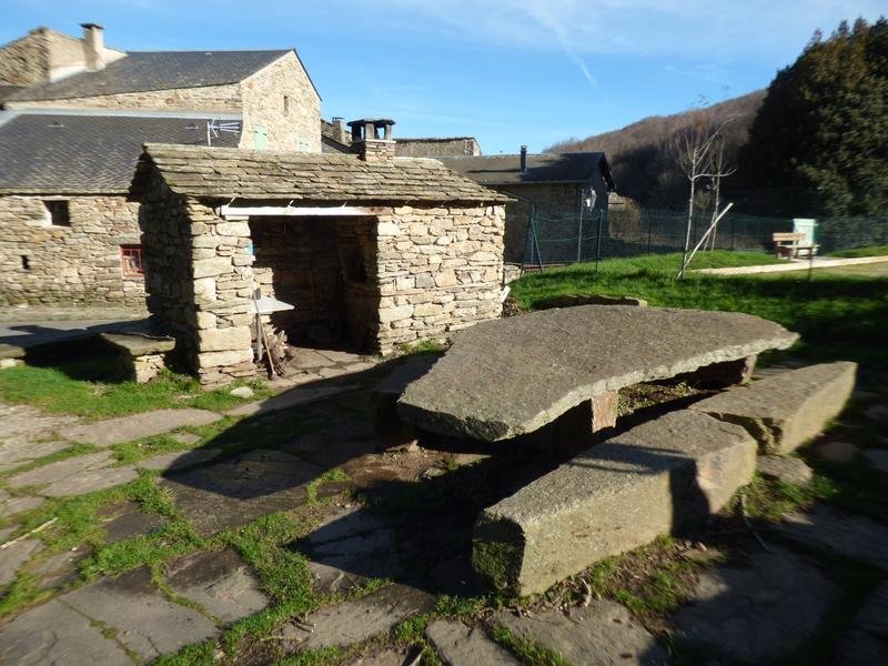 Grande table de pierre au départ des sentiers de randonnée, ruisseau et point d'eau à proximité et parking obligatoire à l'entrée du village. Livres à disposition dans le four à pain tout proche.
