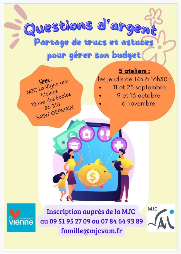 À partir du 11 septembre, des ateliers "questions d'argent" auront lieu à la MJC VAM. Ils seront animés par la "maison des solidarités" de Chauvigny et par la MJC. Nous pourrons parler de la place de l'argent dans notre quotidien, du budget, s'échanger des trucs et astuces, le tout dans une ambiance conviviale !