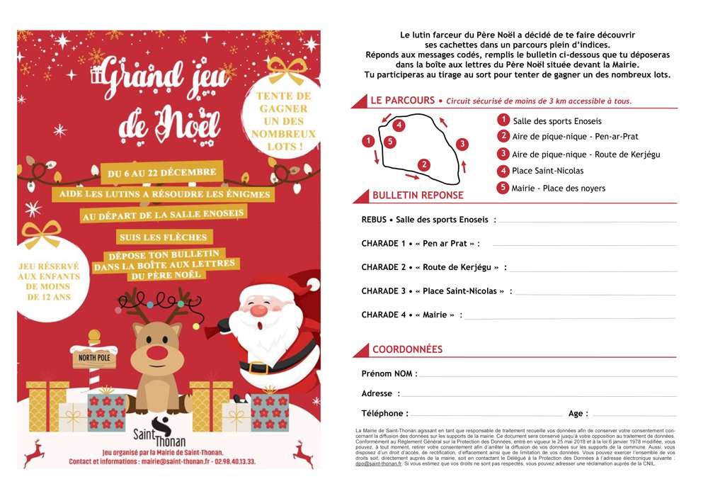 Pratique : Le bulletin-réponse « Grand Jeu de Noël » est disponible à la Mairie, sur le site internet : https://www.saint-thonan.fr/wp-content/uploads/2025/12/Grand-Jeu-de-Noel.pdf