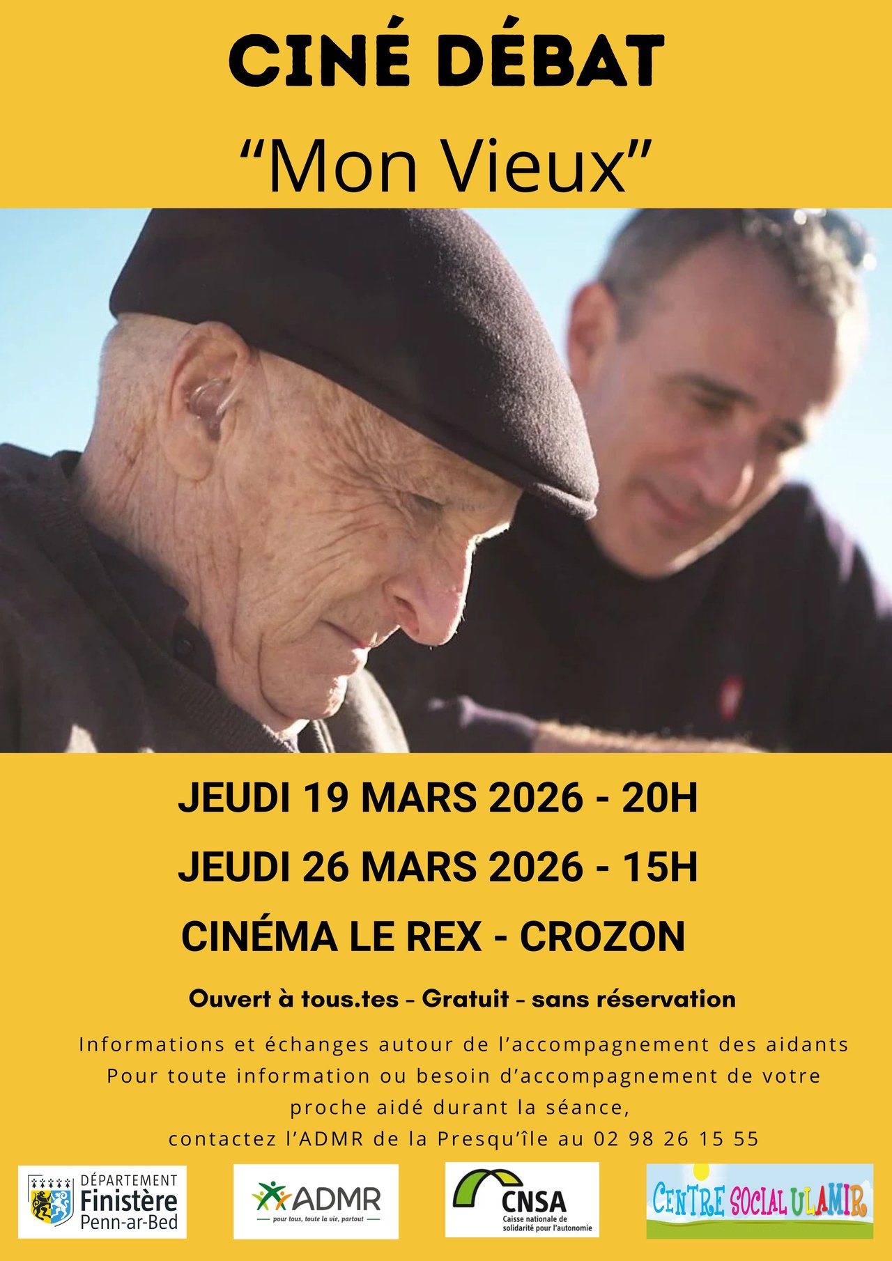 Dans le cadre d’un projet porté par l’ADMR, en partenariat avec le Centre social ULAMIR de la presqu’île de Crozon, et avec le soutien du Département du Finistère et de la CNSA, nous avons le plaisir de vous inviter à un ciné-débat autour du film Mon Vieux, réalisé par Élie Semoun et Marjory Dejardin.