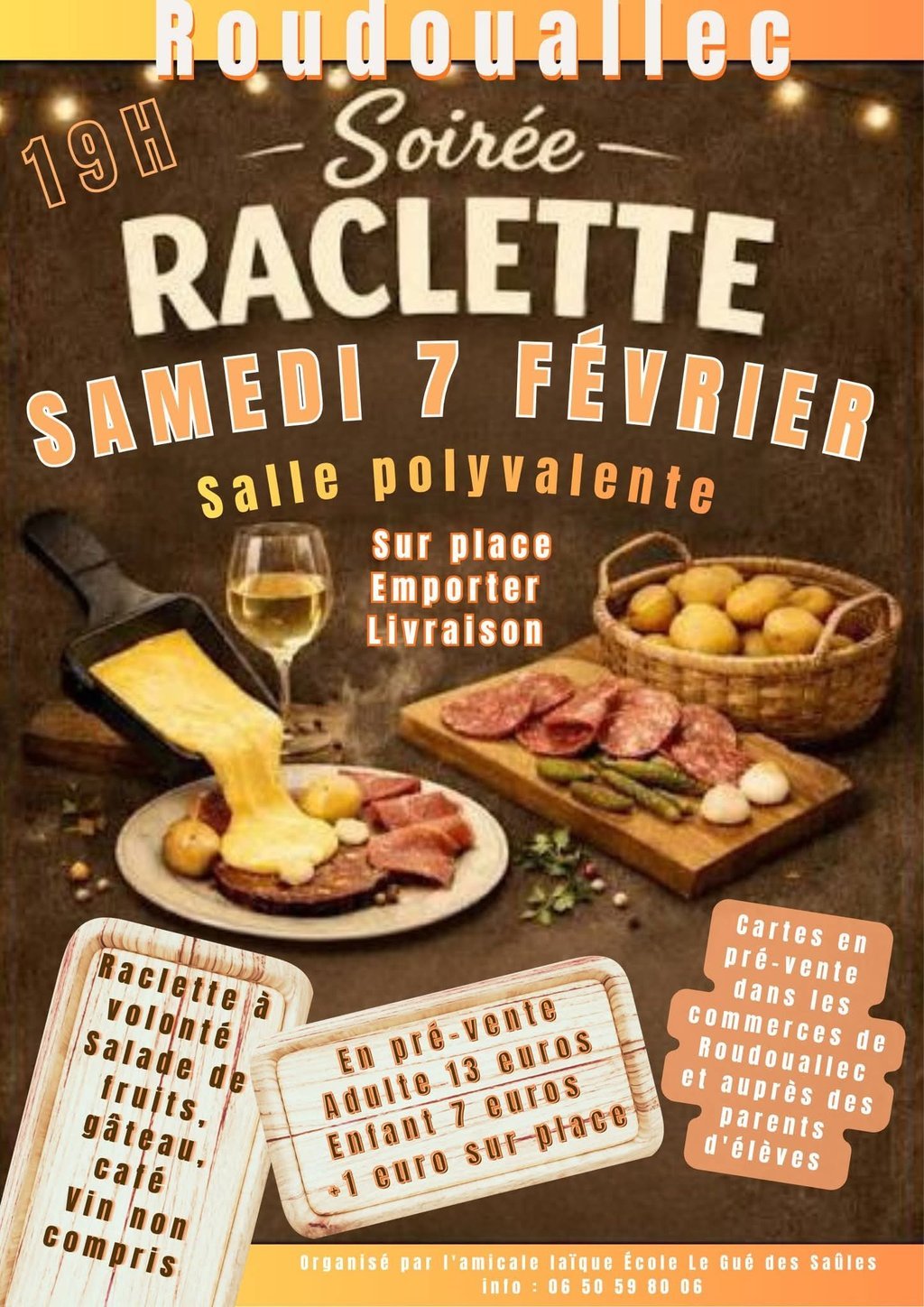 Organisée par l'amicale laïque. Sur place ou à emporter. Carte en pré-vente dans les commerces de la commune et auprès des parents d'élèves.