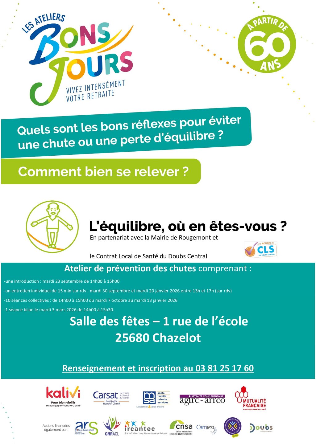 📍 Participez à un cycle d’ateliers autour de l’équilibre, organisé à Chazelot en partenariat avec la Mairie de Rougemont et le Contrat Local de Santé du Doubs Central.