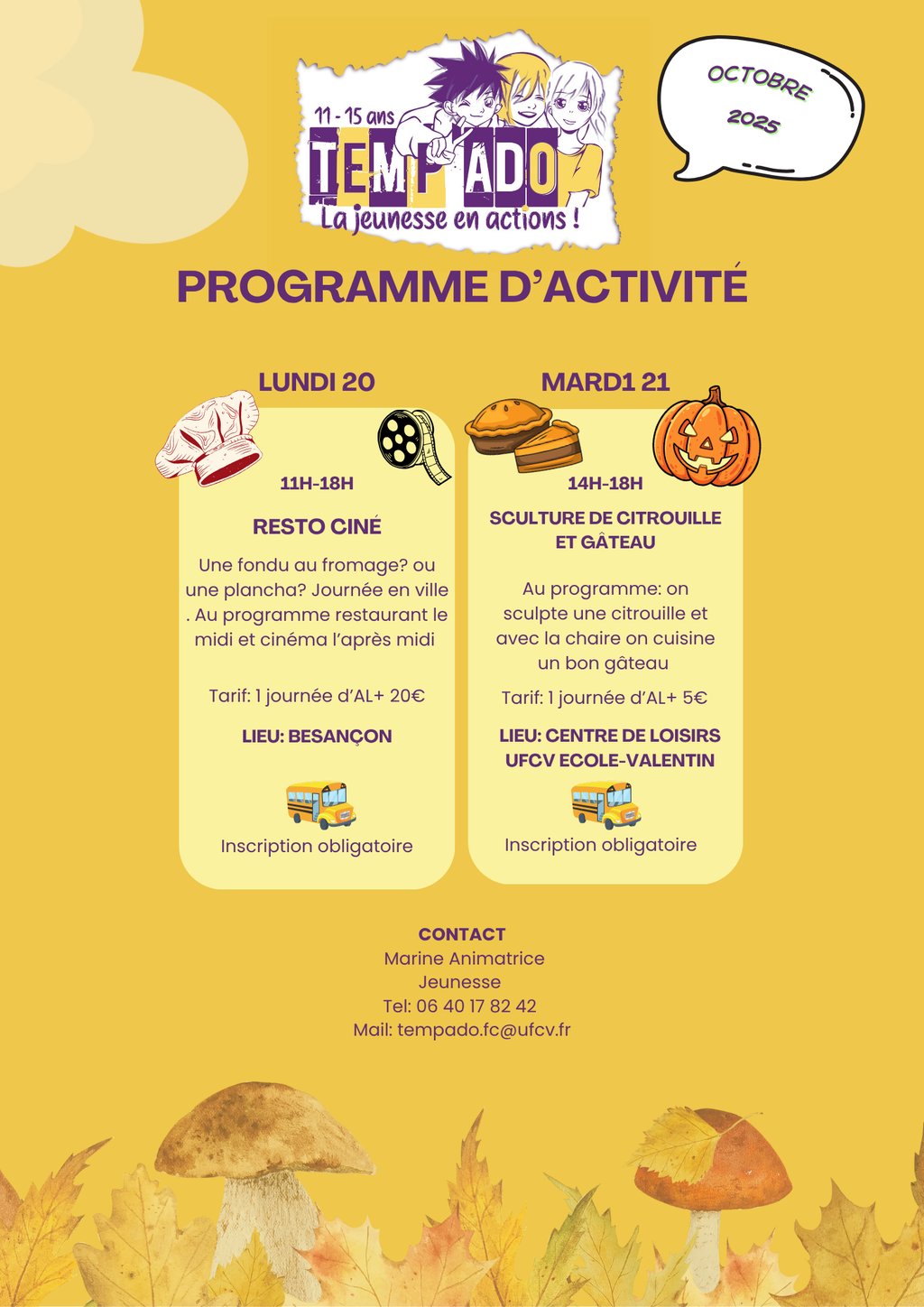 Le dispositif Temp’Ado revient pour les 11-15 ans avec un super programme : resto & cinéma, sculpture de citrouilles, gâteau maison et bonne humeur garantie !