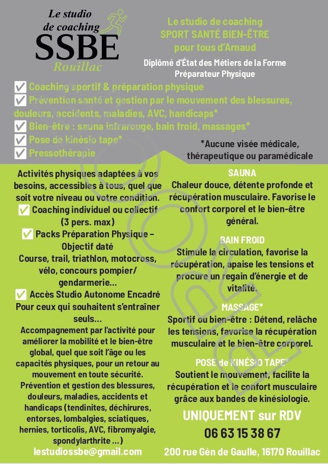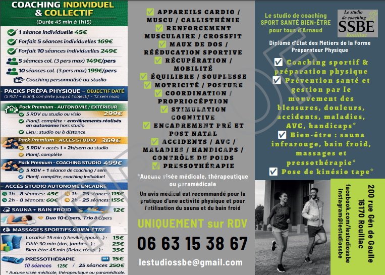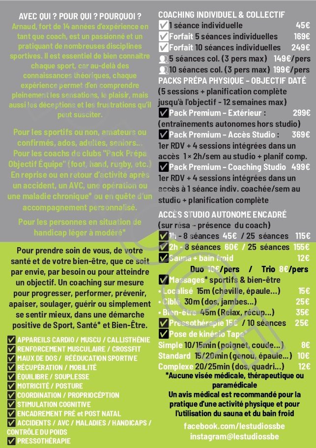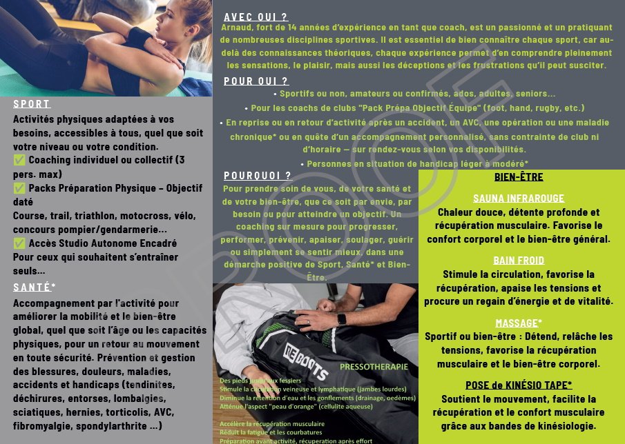 ✅ Coaching sportif & préparation physique ✅ Prévention santé et gestion par le mouvement des blessures, douleurs, maladies, AVC, handicaps* ✅ Bien-être : sauna, bain froid, pressothérapie et massages* ✅ Pose de kinésio tape*