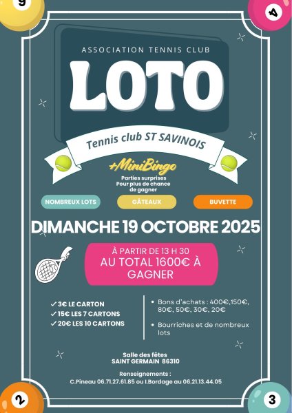 L'Association Tennis Club organise un Loto le dimanche 19 octobre 2025 à partir de 13h30 dans la Salle Abel DEMAY.